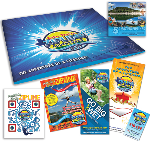 Lake Travis Zipline Adventures Cinema Ad Creation, Marketing Brochures and Collateral, Gift Cards, Logo, QR Codes, Business Cards, Table Toppers and Magazine Ads
